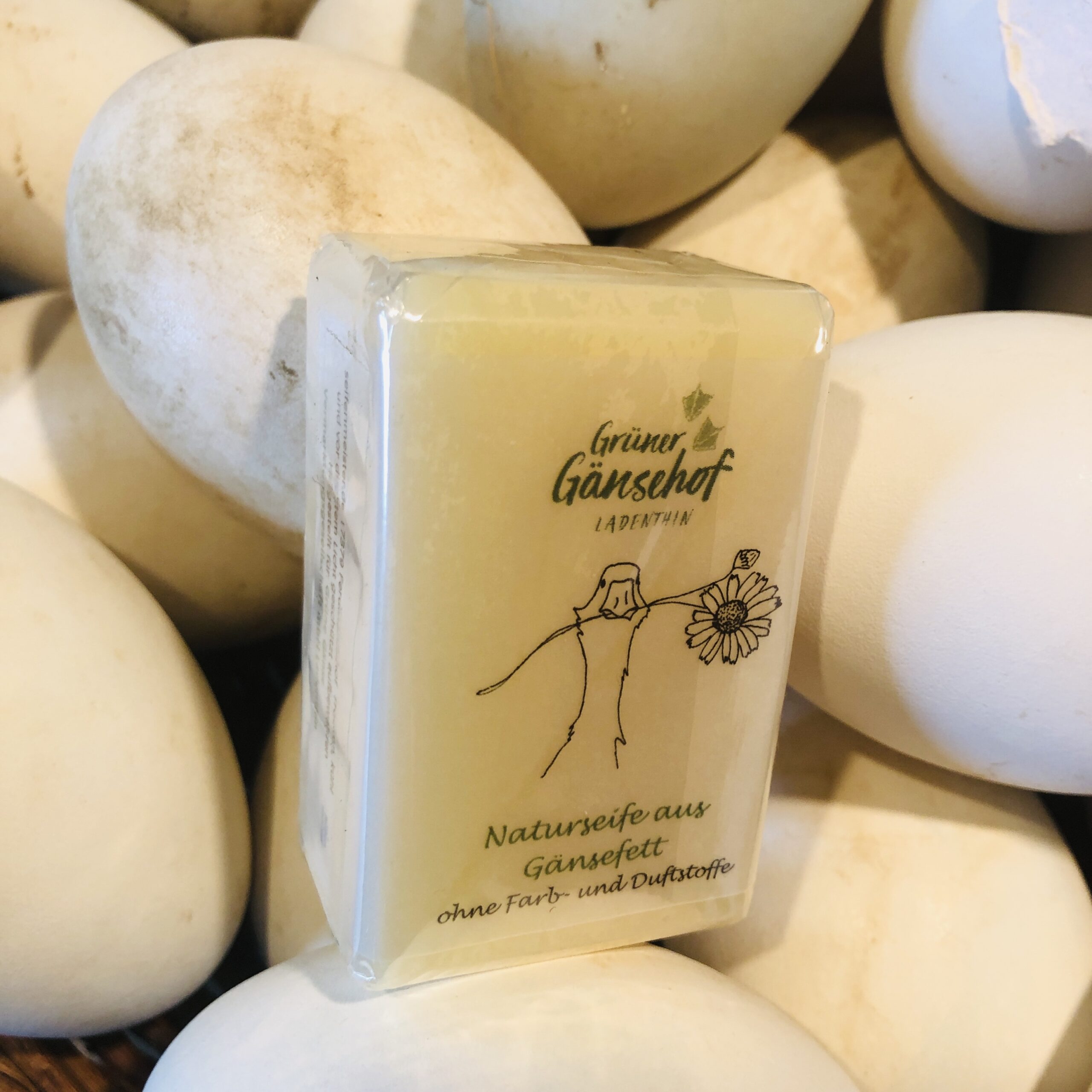 Wie wäre es mit einer aus Gänsefett gefertigten Naturseife – besonders geeignet für sensible Hände und nach historischer Rezeptur gefertigt.