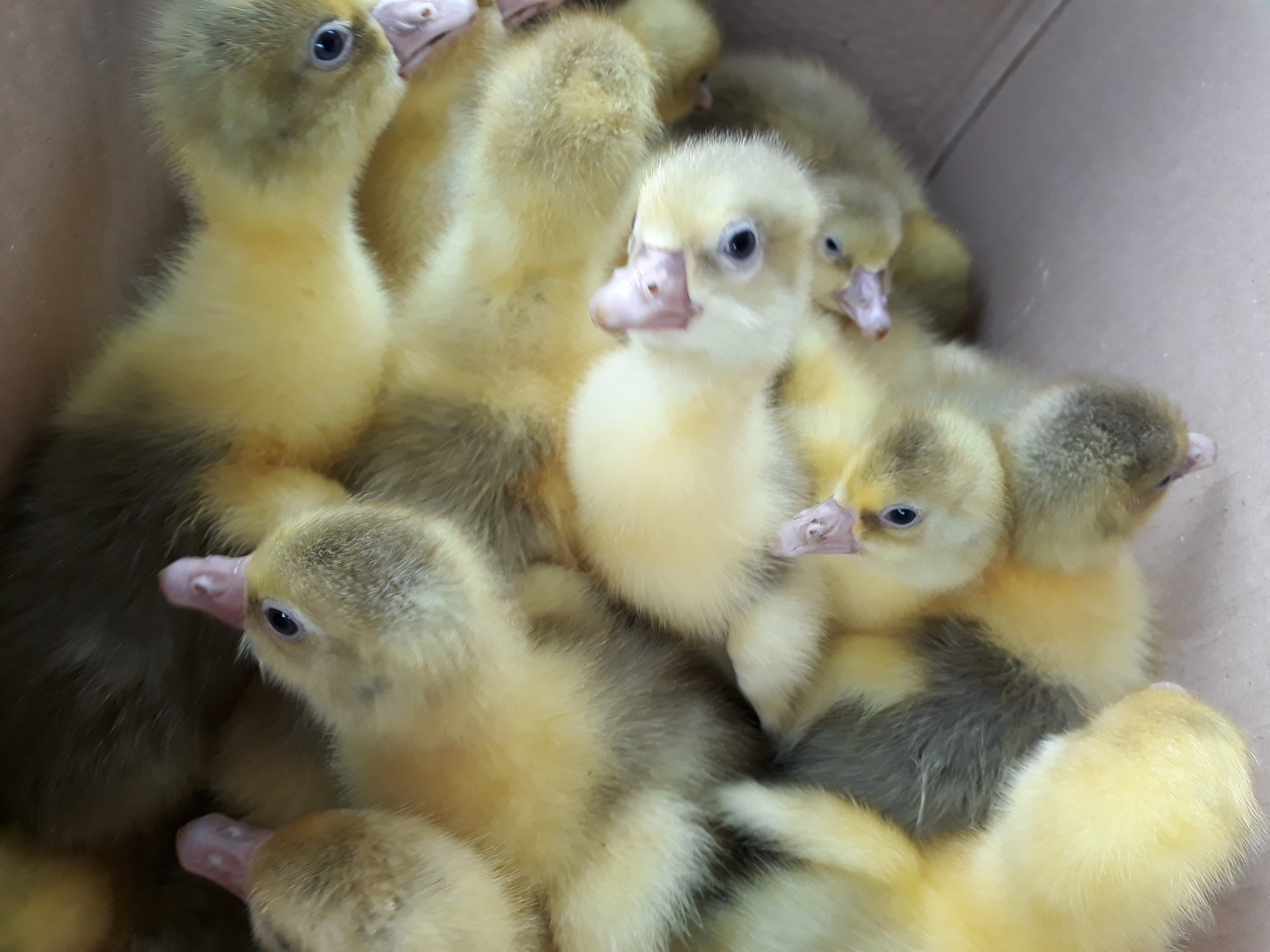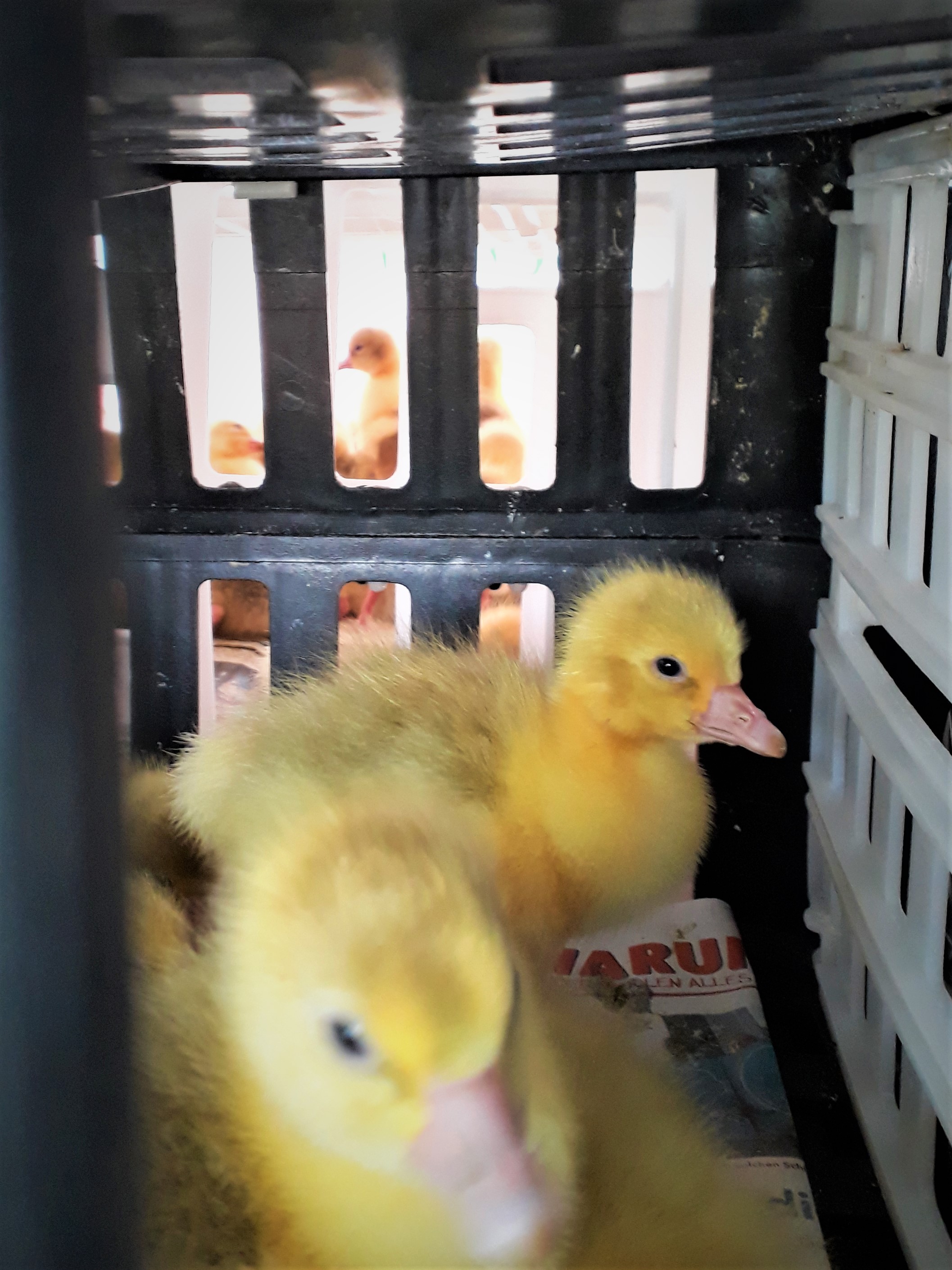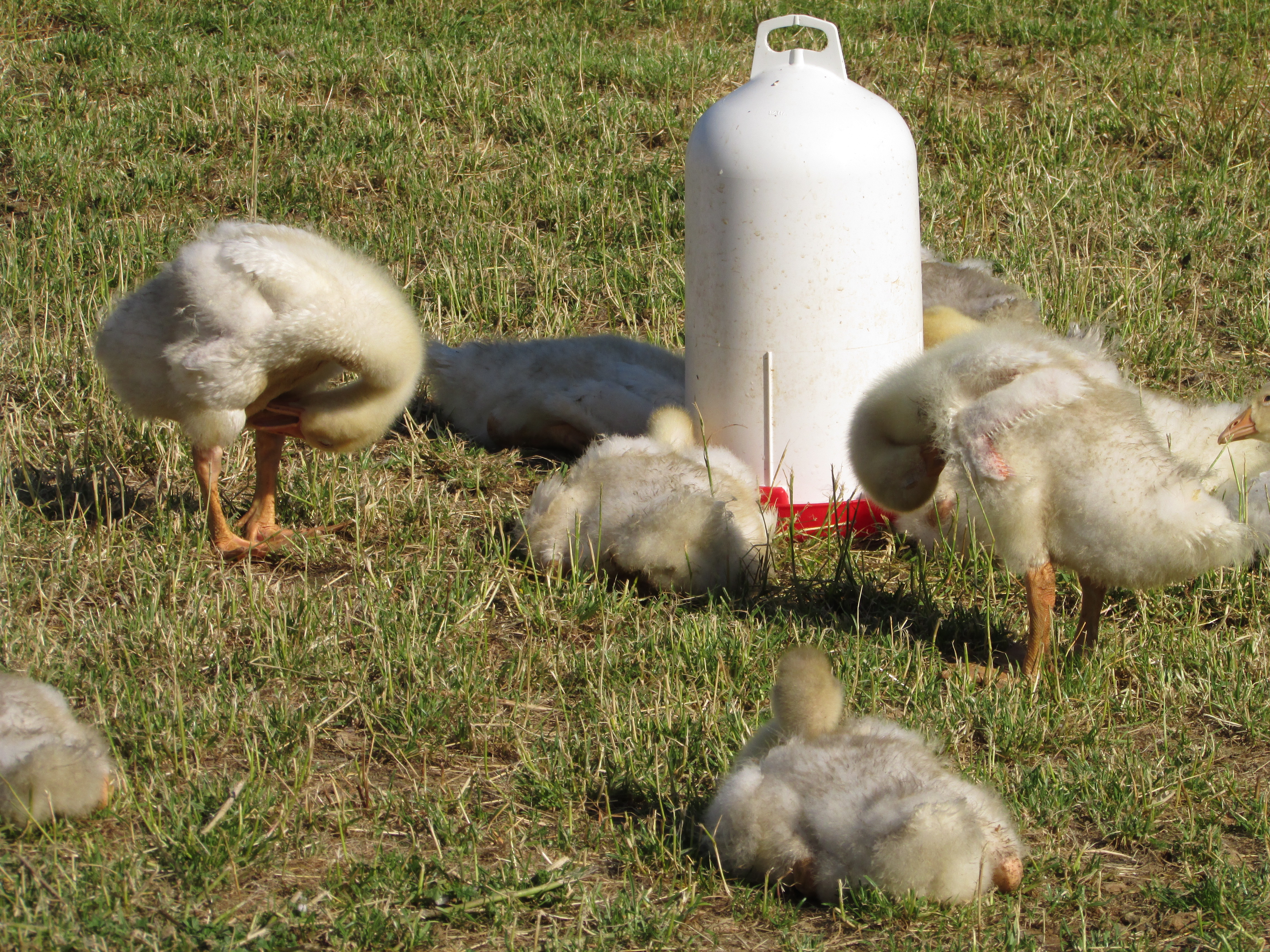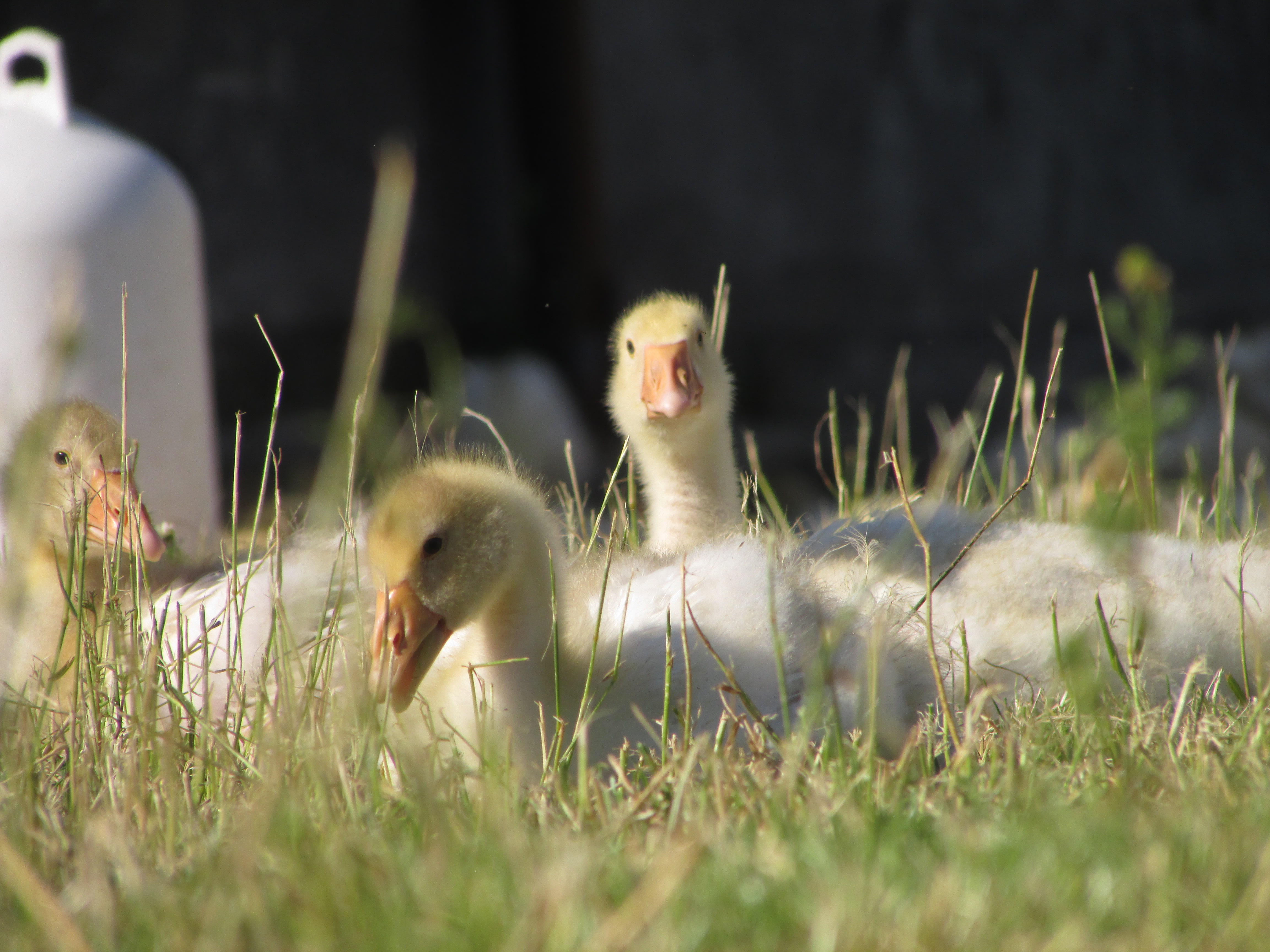 Am 15. Mai zogen die am Vortag frisch geschlüpften Gössel auf unserem Hof ein und verbrachten ihre ersten Tage zusammen gekuschelt unter der wärmenden Infrarotlampe und erkundeten zwei Wochen später bereits ausgiebig den Stall.