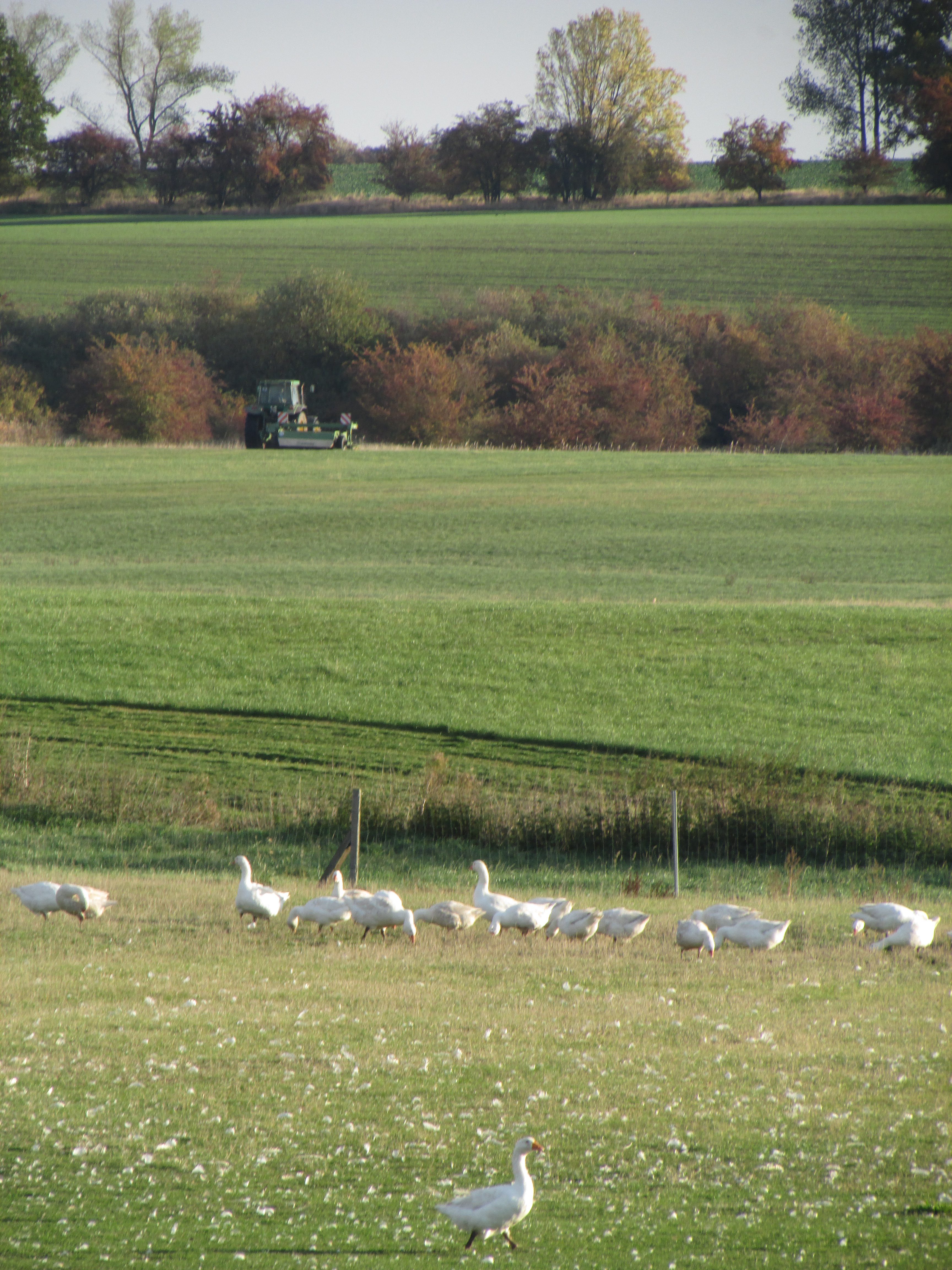 Doch in dieser Zeit zeigte sich bereits die ersten Dürreerscheinungen und das Gras wurde knapp. Daher bekamen unsere Gänsekinder schon im Mai regelmäßig zusätzlich Grünfutter auf der Weide in Form von frisch geschnittenem Mais.